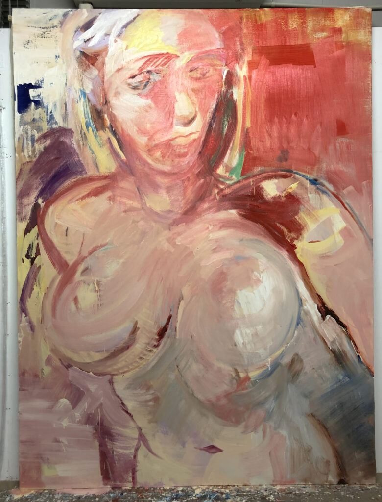 With a flat brush wider than 20 cm, the female body is expressed on a large scale. Due to its large size, paint is applied in many different ways to build up texture — for example, throwing loosened paint onto the surface — in order to maximize the variety of textures.
